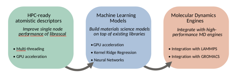 To this end, we will work in three main directions, summarized in figure 1: improving the node-level performance of librascal, including the development of GPU-accelerated feature evaluation, adding integration with machine learning libraries to allow accelerated model evaluation, and integrating librascal and the machine learning models within existing, high-performance molecular dynamics engines.